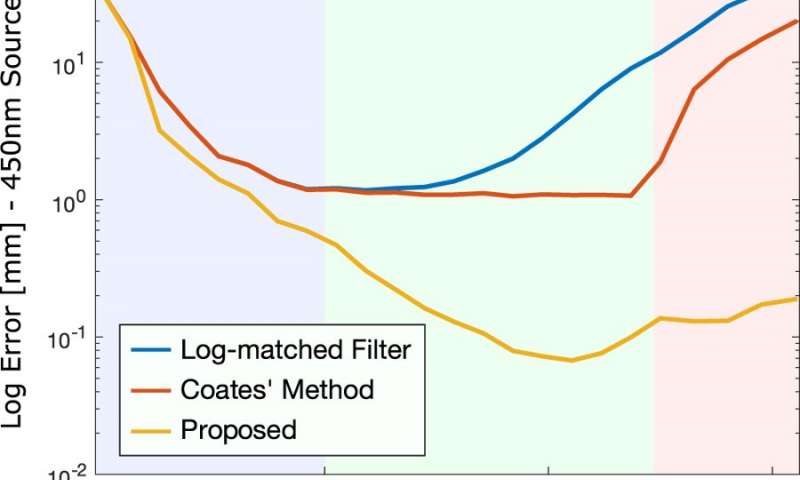 最佳光子計數(shù)方案。450 nm Alphalas LD-450-50激光器(FWHM為90 ps)的變化光子數(shù)的深度重建精度。比較了傳統(tǒng)的對數(shù)匹配濾波器,Coates方法和提出的方法。最佳的光子數(shù)量平均位于每個脈沖平均檢測到1個光子的非常規(guī)區(qū)域附近,與脈沖響應(yīng)無關(guān),并且直方圖bin寬度范圍很廣。圖片來源:Scientific Reports,Doi:10.1038 / s41598-018-35212-x