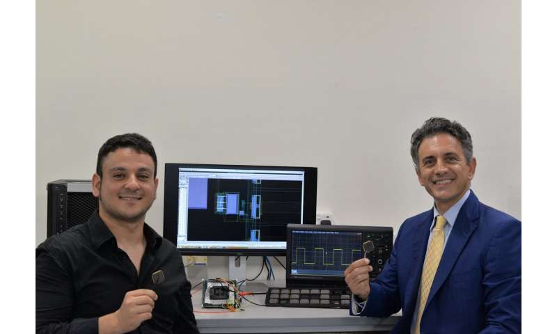 NUS研究人員發(fā)明了一種低成本的“無電池”喚醒定時器,可將IoT傳感器節(jié)點的功耗降低1000倍,從而有助于持久運行。 喚醒定時器嵌入在測試芯片中,并放置在較大的封裝中(由兩個研究人員持有),以便于測試和表征。 左起:新加坡國立大學工程學院的Orazio Aiello博士和Massimo Alioto副教授學分:新加坡國立大學