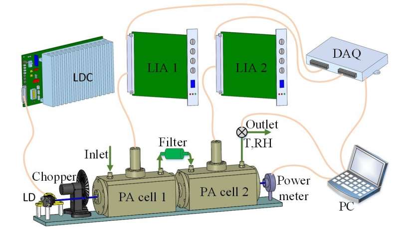 研究小組成員劉Kun教授解釋說:“該PAS(D-PAS)基于443 nm激光二極管! “通過優(yōu)化聲諧振器的結構,我們實現(xiàn)了在線測量氣溶膠吸收和NO 2的高靈敏度和大流量。”
