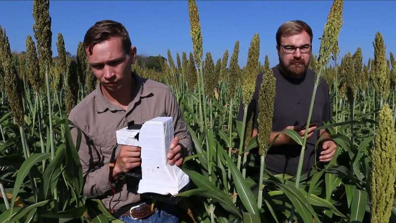 普渡大學農(nóng)學系的博士后研究助理尼爾·卡彭特(Neal Carpenter)(左)走遍了玉米和高粱領域,準備使用普渡大學開發(fā)的手持式傳感器來測量植物的健康狀況。馬修·芬頓(Matthew Fenton)使用智能手機收集數(shù)據(jù)。普渡大學農(nóng)業(yè)與生物工程學系的助理教授Jian Jin希望他的高光譜成像設備將在國內(nèi)外的植物科學家和農(nóng)民中廣泛使用。圖片提供:Purdue Research Foundation圖片/ Oren Darling