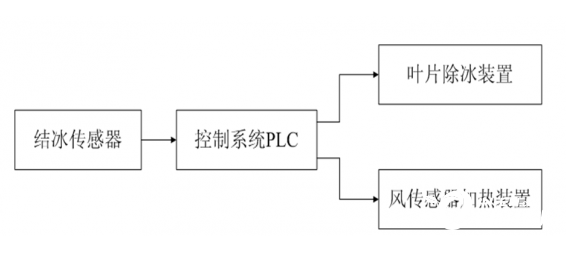 結(jié)冰傳感器安裝在機(jī)艙頂部,將結(jié)冰厚度信息轉(zhuǎn)換成電壓或電流信號(hào),傳送給風(fēng)機(jī)主控系統(tǒng)PLC。PLC根據(jù)預(yù)先設(shè)定的冰層厚度閥值控制除冰裝置的起停。利用機(jī)組主控系統(tǒng)PLC預(yù)留的IO接口即可實(shí)現(xiàn)結(jié)冰厚度的采集和除冰裝置的控制,降低系統(tǒng)成本。