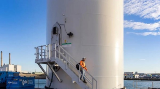 在荷蘭鹿特丹港口,一臺巨大的風力發(fā)電機正在工作。其直徑比兩個橄欖球場還要大,后續(xù)建設的風機將比西歐大陸上的任何建筑物都要高。