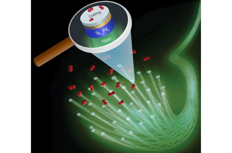 圖1.光學(xué)氫傳感器如何工作的示意圖。在氫附近,鉭(Ta)和鈀(Pd)基材料吸收氫(H)。該區(qū)域中的氫氣量越大,材料吸收的氫氣越多。隨著材料吸收氫,其光學(xué)性質(zhì)會發(fā)生變化。通過例如測量由材料反射的光的量,可以確定氫壓力或氫濃度。圖片來源:TU Delft