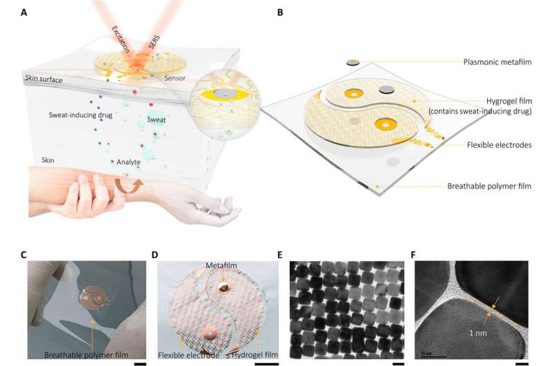 等離子體等離子材料集成的可穿戴SERS傳感設(shè)備。(A)顯示該設(shè)備工作原理和設(shè)計(jì)的示意圖;(B)由兩個(gè)主要組件(排汗組件和SERS感應(yīng)組件)組成,其樣式看起來像是陰陽符號。插圖突出顯示了干膠片附近的按鍵感應(yīng)界面。(C)該設(shè)備的光學(xué)圖像,(D)出汗組件的放大光學(xué)圖像。在螺旋形的分形網(wǎng)狀電極上安裝了一層薄薄的水凝膠層,上面裝有刺激汗腺分泌的分子(乙酰膽堿氯化物)。請注意,為了突出顯示的對比度,只有一個(gè)電極安裝了水凝膠層和等離激元超膜。圖片來源:浙江大學(xué)王英利。(E和F)安裝在電極中央的SERS傳感組件的高分辨率透射電子顯微鏡(TEM)圖像,該組件是由有序的銀納米立方體(NC)超晶格形成的等離子超薄膜。1 cm(C),5 mm(D),50 nm(E)和5 nm(F)的比例尺。圖片來源:Science Advances,doi:10.1126 / sciadv.abe4553