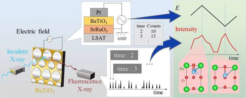 來自BaTiO_3薄膜的熒光X射線由帶有時間標(biāo)記信息的固態(tài)檢測器檢測,該時間標(biāo)記信息與薄膜上的施加電壓同步以獲得光譜的時間變化。圖片來源:廣島大學(xué)中島信男