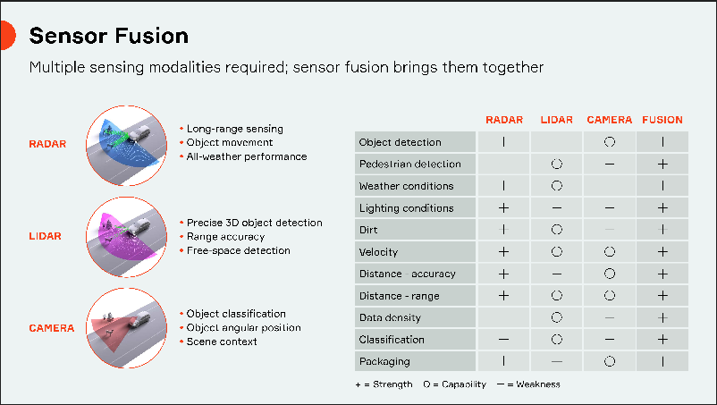 每種傳感器類型或“模態(tài)”都有其固有的優(yōu)點(diǎn)和缺點(diǎn)。雷達(dá)即使在惡劣的天氣條件下也能準(zhǔn)確確定距離和速度,但非常強(qiáng)大,但無(wú)法讀取路牌或“看到”交通信號(hào)燈的顏色。相機(jī)可以很好地讀取標(biāo)志或?qū)ξ矬w進(jìn)行分類,例如行人,騎自行車的人或其他車輛。但是,它們很容易被灰塵,陽(yáng)光,雨水,雪或黑暗所蒙蔽。激光雷達(dá)可以準(zhǔn)確地檢測(cè)物體,但是它們沒(méi)有相機(jī)或雷達(dá)的承受能力或承受能力。