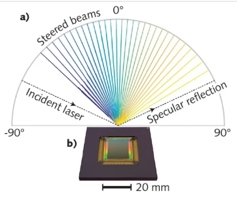 基于相同的原理,LCM 是反射式一維超表面,利用諧振亞波長(zhǎng)元件的液晶調(diào)諧。在該方案中,每個(gè)諧振器的相位延遲與施加到它的電壓成正比,這會(huì)局部旋轉(zhuǎn)液晶,改變諧振波長(zhǎng)并實(shí)現(xiàn) 120° 視場(chǎng)和整個(gè)視場(chǎng)的均勻效率。