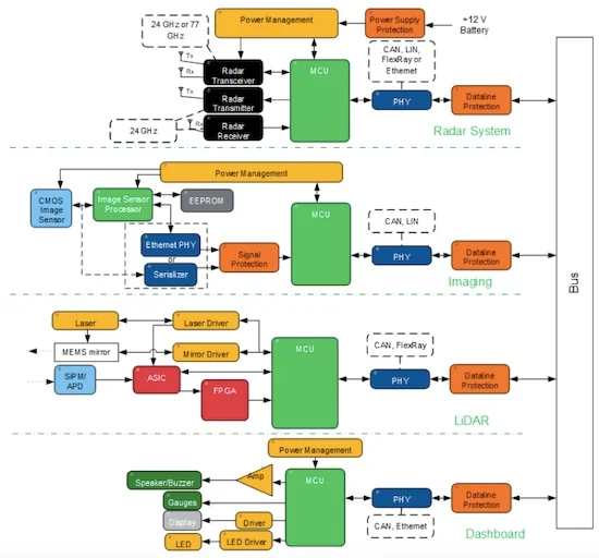 高級(jí)駕駛員輔助系統(tǒng)的示例框圖。圖片由安富利提供