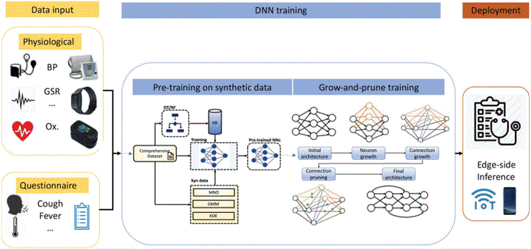 這些數(shù)據(jù)是從意大利北部一家醫(yī)院的健康、無癥狀和有癥狀的個體中收集的。醫(yī)生在那家醫(yī)院給它們貼上標簽,以實現(xiàn)有監(jiān)督的機器學習。然后使用基于我們的增長和修剪神經(jīng)網(wǎng)絡合成程序的數(shù)據(jù)訓練神經(jīng)網(wǎng)絡。