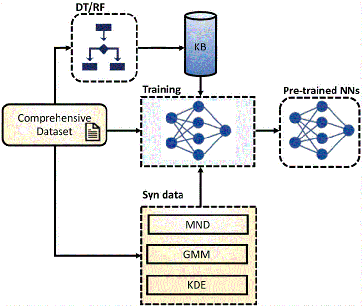 使用合成數(shù)據(jù)集(DT/RF:決策樹/隨機森林,NN:神經(jīng)網(wǎng)絡,KB:知識庫)對 DNN 模型進行預訓練的示意圖。