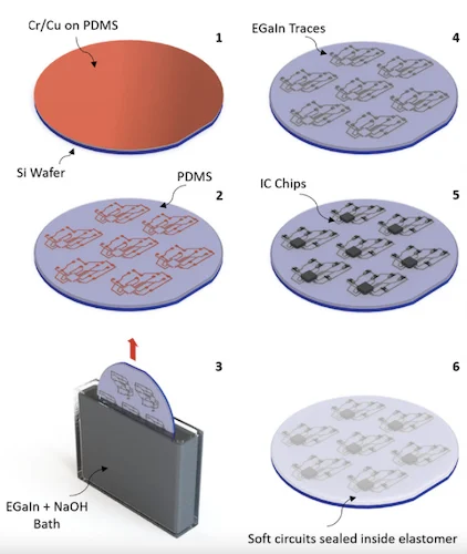 在這里,薄銅跡線被光刻圖案化到彈性體表面作為潤濕層。然后,浸涂能夠?qū)?EGaIn 選擇性沉積到電路布局上。浸涂是使用定制的機(jī)器實(shí)現(xiàn)的,該機(jī)器將晶片浸入由頂部表面的氫氧化鈉 (NaOH) 水溶液組成的浴槽中,然后是 EGaIn。NaOH 去除氧化皮,而 EGaIn 則根據(jù)需要沉積。