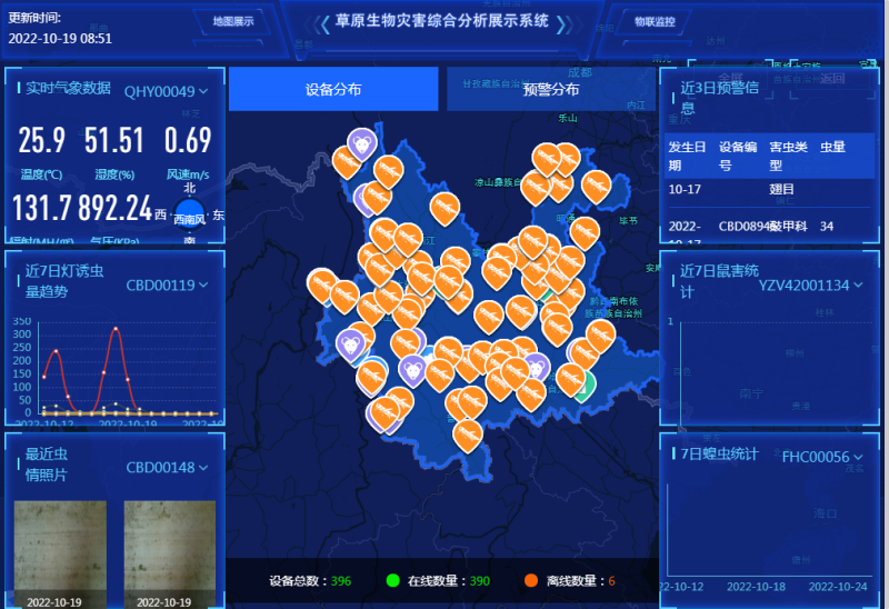 根據(jù)云南省第三次國(guó)土資源調(diào)查,云南草地面積1984.33萬(wàn)畝,主要分布在迪慶、曲靖、紅河、昆明、昭通等5個(gè)州市。云南省草原生物災(zāi)害監(jiān)測(cè)預(yù)警體系試運(yùn)行3個(gè)月以來(lái),設(shè)備運(yùn)行正常。截至記者發(fā)稿,共監(jiān)測(cè)識(shí)別昆蟲(chóng)88種,數(shù)量達(dá)2092萬(wàn)頭,為完成今年180萬(wàn)畝草原有害生物防治目標(biāo)任務(wù),提供了防治決策管理科學(xué)依據(jù),對(duì)增強(qiáng)云南生物災(zāi)害防控水平、維護(hù)草原生物多樣性、保障林草資源安全意義重大。