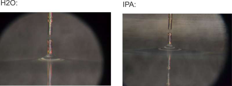研究人員使用新傳感器通過測量從水(左)和異丙醇(右)中取出微型圓柱體時(shí)的回縮力來測量液體的表面張力。圖片來源:馬里博爾大學(xué) Denis Donlagic