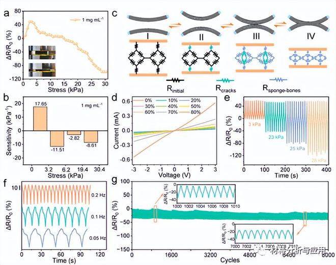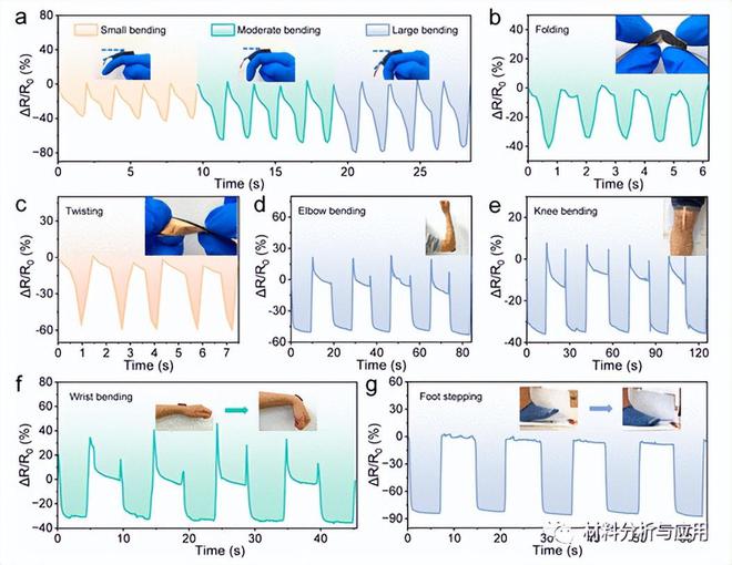 圖4. RGO@PU海綿傳感器在人體運(yùn)動(dòng)檢測(cè)的各種應(yīng)變中的應(yīng)用