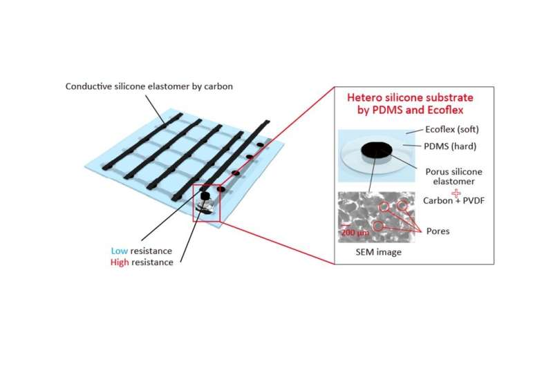 陣列示意圖。這種有機硅基材由兩種具有不同硬度值的硅膠類型制成。較硬的硅膠PDMS在壓力部分可以控制壓力傳感元件在拉伸過程中的變形。來源:橫濱國立大學太田弘樹