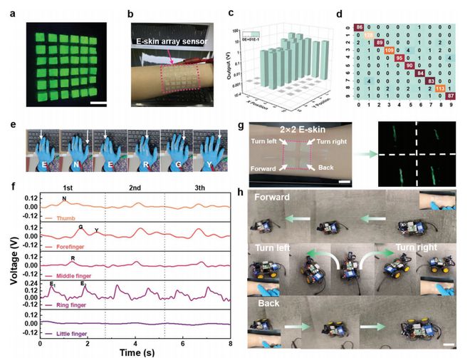 傳感器應(yīng)用主要為一個(gè)自供電的6×6皮膚陣列傳感器,通過給出雙信號(hào)來繪制壓力圖。當(dāng)像素1-6、9、10、15、16、21、22、27、28、33和34被手指按順序按下時(shí)(字符“T”的軌跡),相關(guān)像素的出現(xiàn)電壓,并顯示了字母的軌跡。通過開發(fā)一個(gè)集成了機(jī)器人技術(shù)的無線信號(hào)傳輸模塊和分類指令的軟件,建立了一個(gè)智能控制系統(tǒng)。當(dāng)手指在簡化的電子皮膚的4個(gè)象限上書寫,微型汽車根據(jù)書寫坐標(biāo)執(zhí)行向前、后退、左、右轉(zhuǎn)。這樣,汽車就能夠及時(shí)修改其移動(dòng)軌跡,避開障礙物,說明該控制系統(tǒng)是有效率、靈活的。