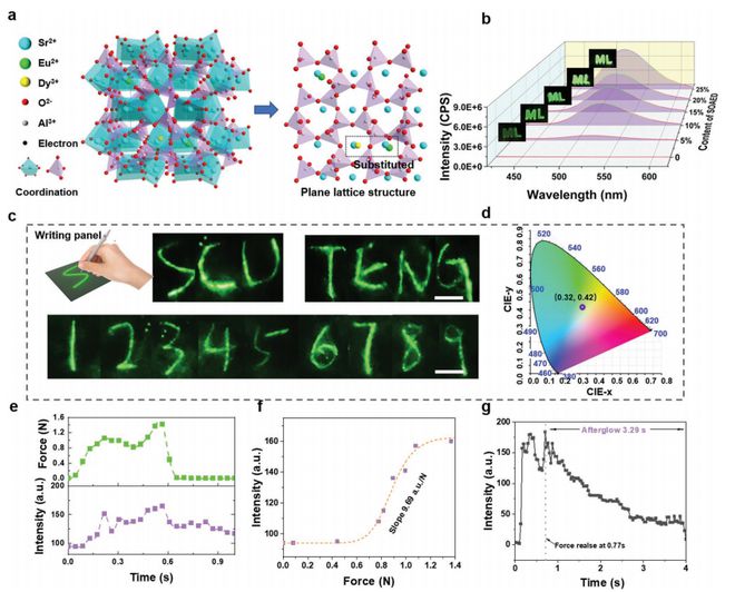 SAOED的最大激發(fā)波長位于360 nm。發(fā)射峰在450-600nm之間為綠色發(fā)光,中心峰在≈520nm。隨后研究了熒光強(qiáng)度與SAOED含量之間的相關(guān)性?梢杂^察到,隨著熒光粉的摻雜質(zhì)量上升到25 wt.%,其強(qiáng)度增加了兩個(gè)數(shù)量級(jí)。通過機(jī)械磨削降低了商用SAOED的平均尺寸,以研究粒徑對(duì)發(fā)光性能的影響。發(fā)射波長的SPH薄膜與熒光粉(最大粒徑≈20µm)轉(zhuǎn)向長波長(1納米),而光致發(fā)光強(qiáng)度增加了11%,這可能是歸因于Eu2+發(fā)光中心暴露在熒光粉的表面積大小減少。優(yōu)化后,得到的傳感器實(shí)現(xiàn)“1-9”數(shù)字和“SCU”、“TENG”字母的完整軌跡顯示,具有高時(shí)空分辨率,可以被肉眼實(shí)時(shí)識(shí)別。以“S”的寫跡為例,其發(fā)光強(qiáng)度的變化與剪切力的變化相一致。結(jié)果表明,發(fā)射量在1.42 N時(shí)達(dá)到最高強(qiáng)度,最低的探測(cè)力為≈0.082N,器件的機(jī)械靈敏度高達(dá)9.69 a.u. N-1。