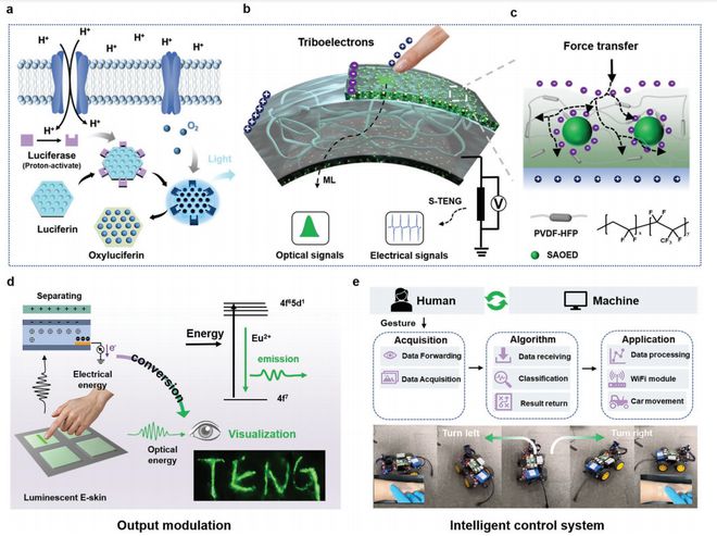 近期,四川大學(xué)張新星團(tuán)隊(duì)研發(fā)了一種可以實(shí)現(xiàn)電/光雙輸出的生物啟發(fā)機(jī)械傳感器。該傳感器具有機(jī)械發(fā)光/摩擦電分層結(jié)構(gòu),能夠?qū)崟r(shí)地感知壓力和模式顯示。研究還發(fā)現(xiàn)界面摩擦電場(chǎng)對(duì)發(fā)光輸出和壓力可視化有促進(jìn)作用。所開發(fā)的機(jī)械傳感器具有自功率、雙信號(hào)和實(shí)時(shí)模式的感覺行為,具有低力檢測(cè)限(0.082 N)、高靈敏度(9.69 a.u. N-1),快速響應(yīng)(35 ms),和良好的可靠性(5000個(gè)循環(huán))。利用該機(jī)械傳感器構(gòu)建了一個(gè)個(gè)性化的人機(jī)交互系統(tǒng)(HMI),并演示了它在智能控制中的應(yīng)用。該工作以題為“Bioinspired Bimodal Mechanosensors with Real-Time, Visualized Information Display for Intelligent Control” 的文章發(fā)表于Advanced Functional Materials上。