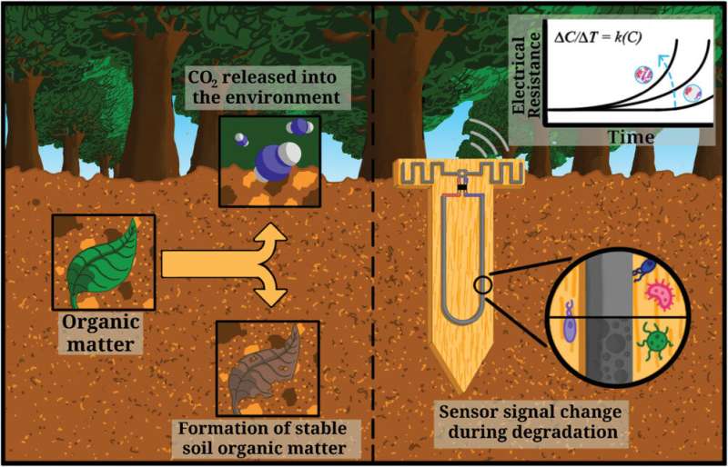 分解傳感器的概念,其中可生物降解的導(dǎo)電痕量的侵蝕速率與土壤中的微生物活動相關(guān)。