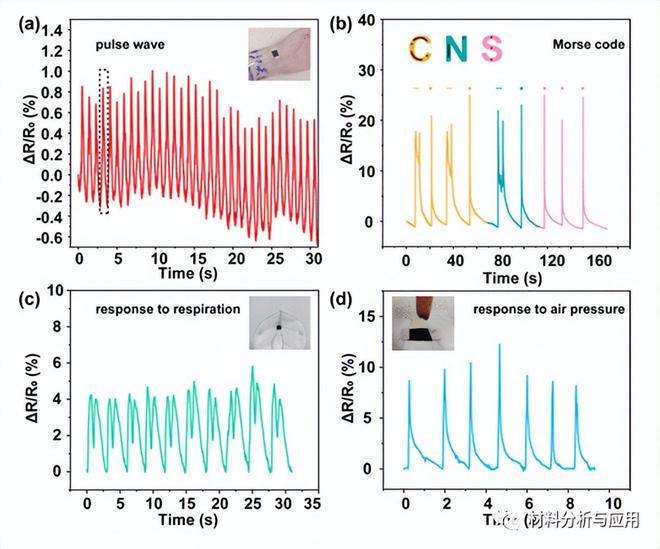通過調(diào)整打印參數(shù),傳感層具有微點(diǎn)特征的GSCA 3D結(jié)構(gòu)可以提供低于60 ms的快速響應(yīng),并將靈敏度提高32.4%(26-78 kPa)、800%(78-102 kPa)和600%(102-160 kPa)。該傳感器具有11.4 Pa的低檢測限和較大的檢測范圍,線性靈敏度為1.4–509 kPa。兩個(gè)相鄰微點(diǎn)之間的蜘蛛腿狀微/納米纖維有助于電子傳輸和氣流傳感。結(jié)果表明,基于石墨烯的點(diǎn)傳感器在識(shí)別空氣強(qiáng)度以及呼吸和氣流方向方面的可行性。GSCA在實(shí)時(shí)個(gè)人監(jiān)控中的進(jìn)一步驗(yàn)證證明了多任務(wù)可穿戴傳感器的潛力。