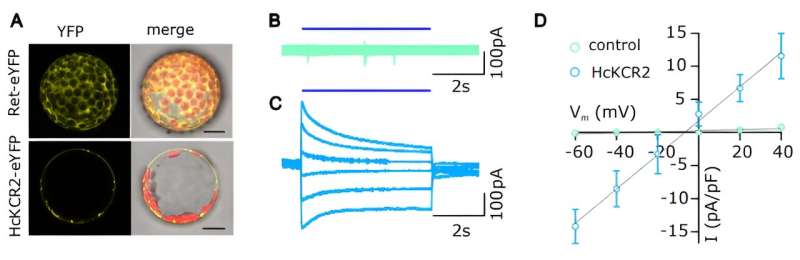 HcKCR2 在植物細(xì)胞中起作用 A. 表達(dá) eYFP 標(biāo)記的 HcKCR2 或?qū)φ?(Ret-eYFP) 的本氏奈瑟菌原生質(zhì)體的共聚焦圖像,在瞬時(shí)轉(zhuǎn)化后 48 小時(shí)捕獲。B-C.用對(duì)照構(gòu)建體(B)或HcKCR2(C)轉(zhuǎn)化的本氏奈瑟菌原生質(zhì)體的膜片鉗實(shí)驗(yàn)中記錄的全細(xì)胞電流。將細(xì)胞保持在 -60 mV 的保持電位,并以 40 至 -60 mV 的步長(zhǎng)進(jìn)行測(cè)試,遞減 20 mV,持續(xù) 8 秒。5 s BL 脈沖 (λ = 490 nm, 5 mW/mm2)施加在每個(gè)電壓階躍上。D.對(duì)照和HcKCR2表達(dá)原生質(zhì)體的I-V關(guān)系。圖片來(lái)源:科學(xué)(2023 年)。DOI: 10.1126/science.adj9696