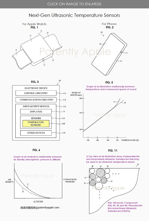 專利文件中還展示了該溫度傳感器的可能應(yīng)用場(chǎng)景,包括安裝在Apple Watch和iPhone等設(shè)備上。此外,專利圖還詳細(xì)解釋了傳感器的工作原理、溫度與聲速之間的關(guān)系、空氣密度與大氣壓強(qiáng)對(duì)海拔的影響,以及壓電微機(jī)械超聲波換能器陣列的構(gòu)造等。