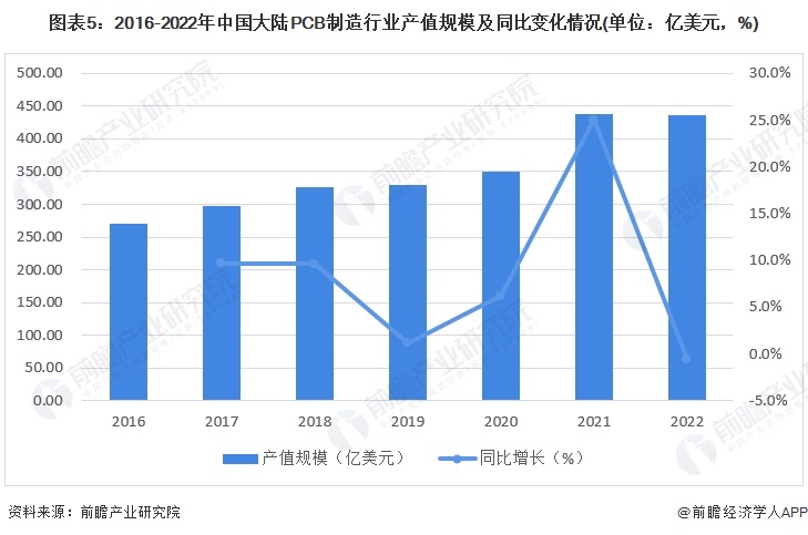 2016-2022年,中國PCB產(chǎn)值規(guī)模整體呈現(xiàn)波動上漲的態(tài)勢。2021年,由于需求復(fù)蘇、技術(shù)要求升級以及原材料價格大幅度上漲等因素影響,推動中國PCB產(chǎn)值強(qiáng)勁增長。2022年,中國PCB產(chǎn)值規(guī)模達(dá)到435.5億美元(按照美元口徑),同比下降0.7%。