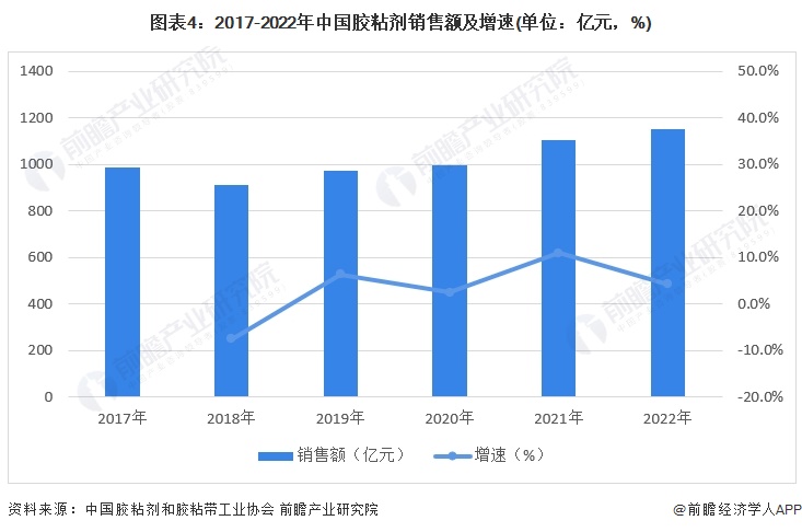 我國膠粘劑行業(yè)的生產(chǎn)規(guī)模迅速擴(kuò)大,產(chǎn)品產(chǎn)銷量保持高速增長。據(jù)中國膠粘劑和膠粘帶工業(yè)協(xié)會統(tǒng)計,2022年我國膠粘劑行業(yè)總產(chǎn)量約788.4萬噸,銷售額約1151.4億元人民幣,分別比2021年增長3.30%和4.37%。隨著新能源行業(yè)的崛起,光伏、風(fēng)電、動力電池對于粘膠劑的需求占比越來越高,同時行業(yè)需求增速也十分快速。