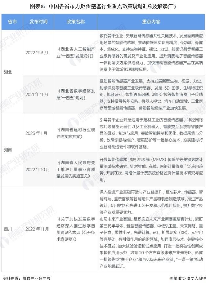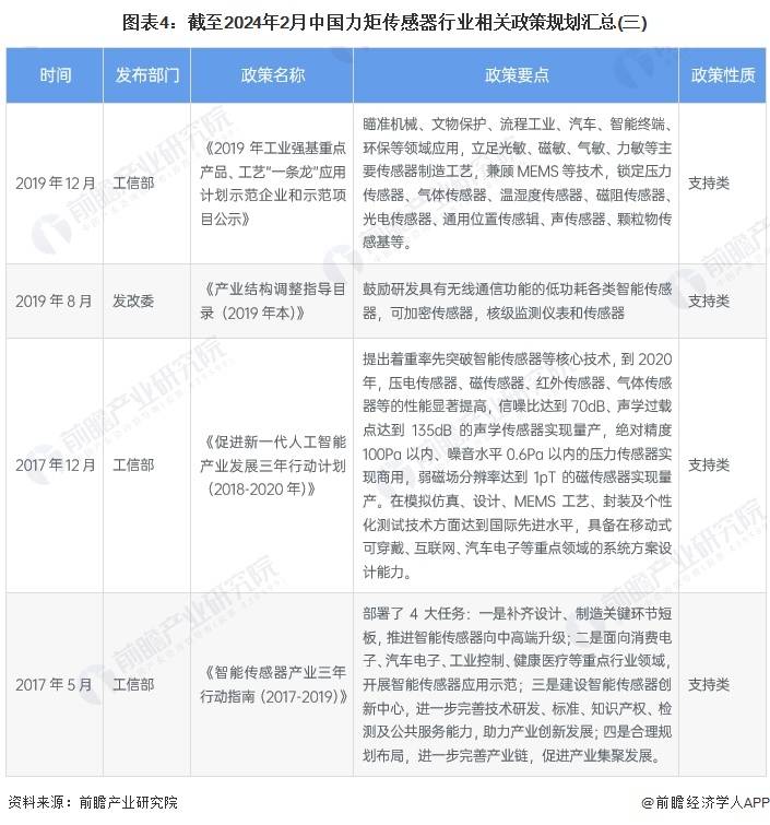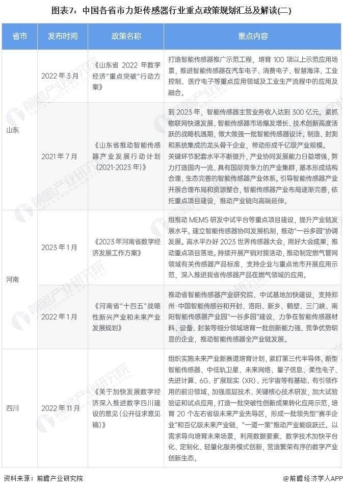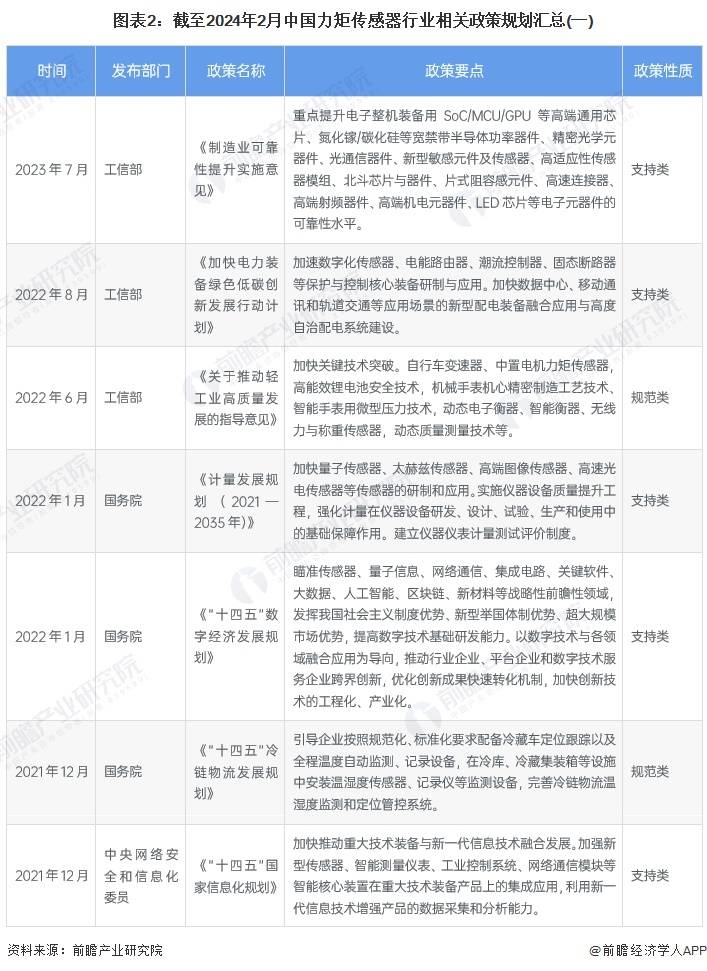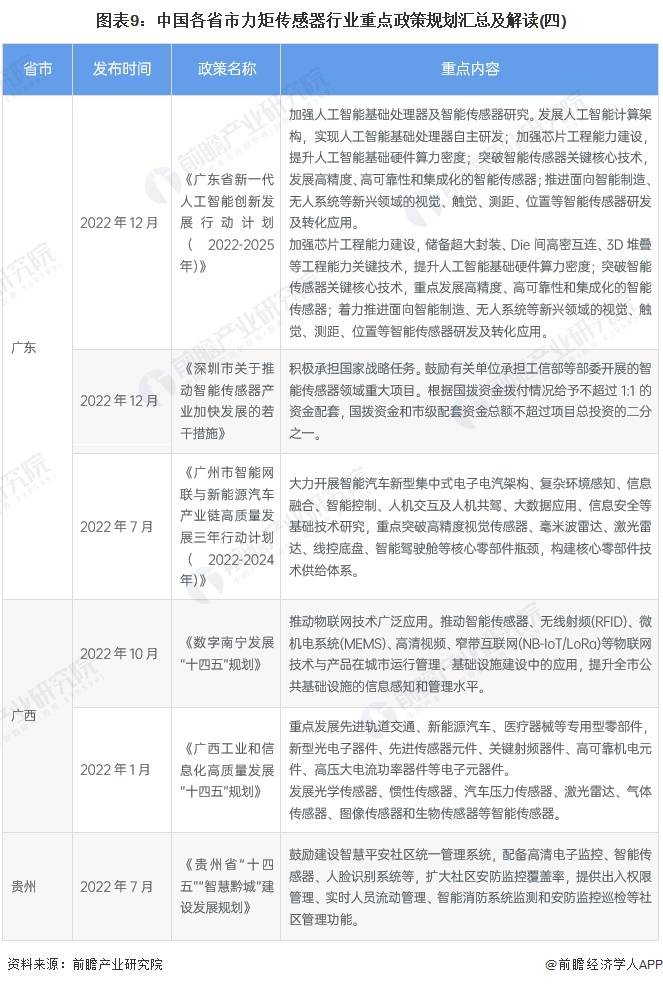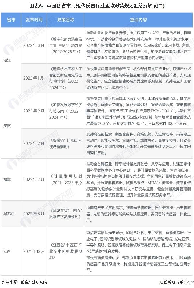 各地政策在傳感器方面發(fā)布的政策較多。盡管針對力矩傳感器的具體政策條文,但是力矩傳感器在高端裝備等領(lǐng)域應(yīng)用更加廣泛,因此各地政策主要鼓勵企業(yè)加強(qiáng)新型傳感技術(shù)研發(fā),高端、智能傳感器技術(shù)的突破!逗邶埥 笆奈濉睌(shù)字經(jīng)濟(jì)發(fā)展規(guī)劃》中提出推進(jìn)光學(xué)傳感器、慣性傳感器、壓電傳感器、電感傳感器等功能集成與規(guī)模應(yīng)用,實現(xiàn)智能傳感器一體化生產(chǎn)!稄V西工業(yè)和信息化高質(zhì)量發(fā)展“十四五”規(guī)劃》中提出發(fā)展光學(xué)傳感器、慣性傳感器、汽車壓力傳感器、激光雷達(dá)、氣體傳感器、圖像傳感器和生物傳感器等智能傳感器。