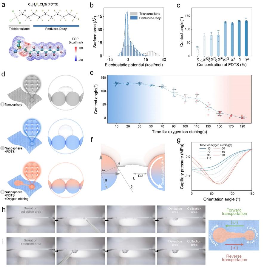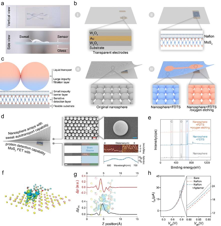 該NM-FET檢測(cè)系統(tǒng)主要由兩部分組成:具有逐步潤(rùn)濕性表面的納米陣列和經(jīng)Nafion/適配體修飾的場(chǎng)效應(yīng)管。納米陣列由直徑為1μm的聚苯乙烯微球組成。經(jīng)全氟葵基三氯硅烷(FDTS)處理和氧離子刻蝕后,納米陣列表面形成親/疏水區(qū)域。納米陣列表面不同區(qū)域的潤(rùn)濕性變化能夠讓汗液在測(cè)試地點(diǎn)實(shí)現(xiàn)自動(dòng)收集和運(yùn)輸。此外,二硫化鉬場(chǎng)效應(yīng)管部分通過(guò)在MoS2材料表面上使用Nafion作為適配體的依附位點(diǎn)進(jìn)行修飾,使得場(chǎng)效應(yīng)管具有可回收性。同時(shí)NM-FET的超薄、超柔性基底,能夠承受一定程度的彎曲變形。NM-FET檢測(cè)系統(tǒng)通過(guò)自動(dòng)汗液收集/過(guò)濾以及真實(shí)汗液中痕量蛋白的高靈敏度檢測(cè),可實(shí)現(xiàn)對(duì)人體免疫狀態(tài)變化的實(shí)時(shí)監(jiān)測(cè)。