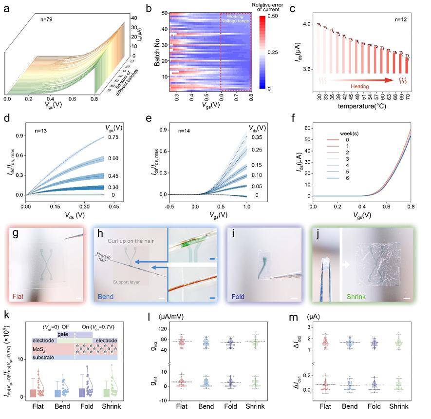 為了評(píng)估不同批次NM-FET的性能穩(wěn)定性,測(cè)試多個(gè)批次場(chǎng)效應(yīng)管傳感器的轉(zhuǎn)移特性曲線(xiàn),發(fā)現(xiàn)其顯示出較為良好的一致性。為驗(yàn)證人體溫度變化對(duì)NM-FET的影響,場(chǎng)效應(yīng)管測(cè)試了溫度范圍30°-70°的電學(xué)性能,其轉(zhuǎn)移特性曲線(xiàn)的電流只從3.99 μA降低到3.7 μA。NM-FET在室溫非密封條件下存儲(chǔ)六周,每周測(cè)試NM-FET的轉(zhuǎn)移特性曲線(xiàn),其電流變化率僅為4.42%。以上結(jié)果說(shuō)明制造批次,溫度以及長(zhǎng)時(shí)間存儲(chǔ)對(duì)NM-FET系統(tǒng)的電學(xué)性能影響較小。為了驗(yàn)證NM-FET柔性基底的抗形變能力,利用彎曲、折疊和皺縮來(lái)測(cè)試每次變形后NM-FET的電學(xué)特性變化,結(jié)果表明NM-FET在經(jīng)歷形變后仍能保持較高的電學(xué)穩(wěn)定性。