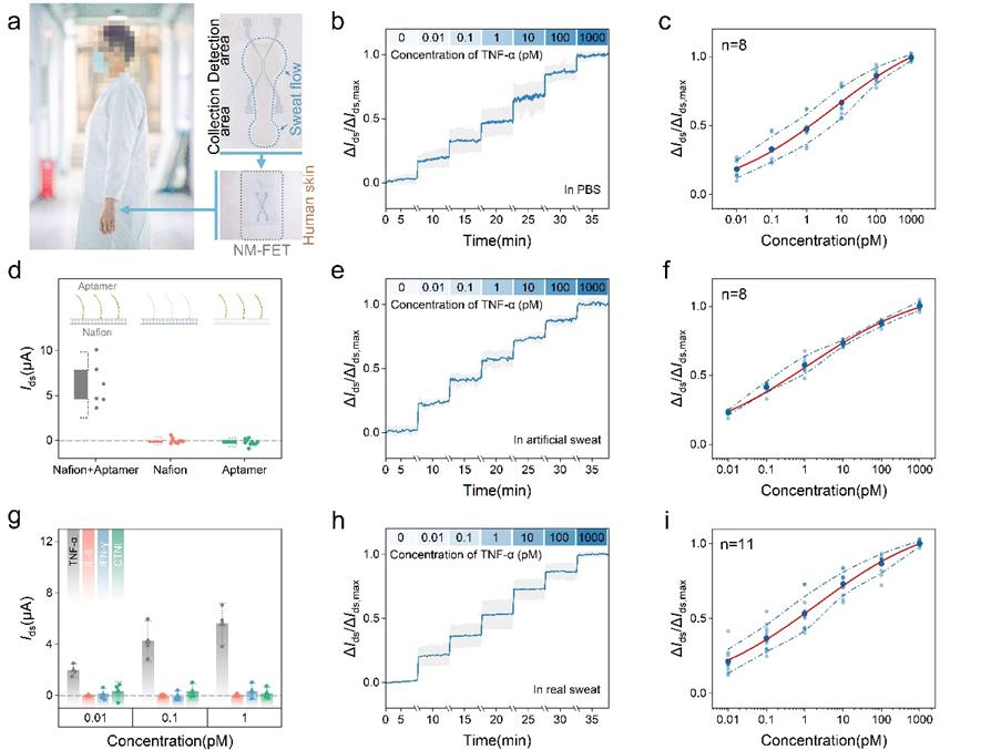 作者將具有逐步潤(rùn)濕性表面的納米陣列,雜質(zhì)隔離的Nafion隔離層以及超薄、超柔性基底等進(jìn)行結(jié)合,開(kāi)發(fā)了納米陣列二硫化鉬場(chǎng)效應(yīng)管(NM-FET),具有汗液自動(dòng)收集運(yùn)輸、雜質(zhì)多層隔離、高靈敏度蛋白檢測(cè)以及可重復(fù)使用等多種功能,NM-FET可以有效分析真實(shí)汗液樣品中的TNF-α蛋白濃度,有望在臨床應(yīng)用中實(shí)時(shí)監(jiān)測(cè)人體汗液中TNF-α蛋白水平。