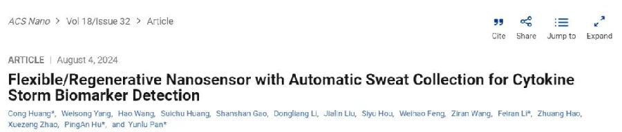 日前,哈爾濱工業(yè)大學(xué)的潘昀路、胡平安教授團(tuán)隊(duì),設(shè)計(jì)開(kāi)發(fā)了一種具有自動(dòng)汗液輸送、雜質(zhì)隔離和可重復(fù)使用功能的高靈敏度柔性監(jiān)測(cè)系統(tǒng)——納米陣列二硫化鉬場(chǎng)效應(yīng)管(NM-FET)。該系統(tǒng)將具有逐步潤(rùn)濕性表面的納米陣列和用Nafion/適配體修飾的場(chǎng)效應(yīng)管傳感器進(jìn)行集成,該系統(tǒng)可檢測(cè)真實(shí)汗液中10fM~1nM范圍變化的TNF-α蛋白濃度。相關(guān)工作以“Flexible/Regenerative Nanosensor with Automatic Sweat Collection for Cytokine Storm Biomarker Detection”為題發(fā)表在《ACS Nano》,并被選為當(dāng)期封面。文章共同第一作者為哈爾濱工業(yè)大學(xué)機(jī)電工程學(xué)院助理研究員黃聰、2023級(jí)博士生楊煒嵩、2021級(jí)博士生王昊、2018級(jí)博士生黃穗楚。