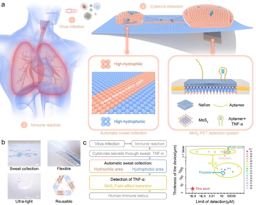 細(xì)胞因子是協(xié)調(diào)人體免疫反應(yīng)的關(guān)鍵蛋白,廣泛存在于血液和組織液等內(nèi)分泌液以及唾液和汗液等外分泌液中,是臨床評(píng)估患者健康狀況的重要生物標(biāo)志物。在呼吸系統(tǒng)疾病中,病毒通過(guò)呼吸道進(jìn)入人體后,免疫系統(tǒng)分泌各種調(diào)節(jié)炎癥的細(xì)胞因子,能夠刺激、集中和擴(kuò)增免疫細(xì)胞。TNF-α作為一種典型的促炎類(lèi)型細(xì)胞因子,在人體的免疫反應(yīng)中尤為重要。通過(guò)監(jiān)測(cè)汗液中的TNF-α濃度,可以有效地評(píng)估機(jī)體的免疫狀態(tài)。傳統(tǒng)的檢測(cè)方法,例如免疫熒光法和酶聯(lián)免疫吸附法,往往需要復(fù)雜的操作和較長(zhǎng)的時(shí)間進(jìn)行檢測(cè),限制了其大規(guī)模應(yīng)用。因此,發(fā)展可穿戴傳感器,實(shí)現(xiàn)對(duì)于痕量蛋白的檢測(cè),成為新的研究熱點(diǎn)。基于二維材料(如MoS2和石墨烯)的場(chǎng)效應(yīng)晶體管傳感器因其無(wú)標(biāo)記、快速響應(yīng)和高靈敏度等優(yōu)點(diǎn)而備受關(guān)注,在人體代謝物和離子檢測(cè)方面得到了初步應(yīng)用。然而,在真實(shí)的檢測(cè)中,人體外分泌液(如汗液)中雜質(zhì)分子的存在會(huì)嚴(yán)重干擾痕量蛋白的有效檢測(cè)。因此,開(kāi)發(fā)能夠直接檢測(cè)未稀釋汗液中細(xì)胞因子的可穿戴設(shè)備成為臨床研究的焦點(diǎn)。