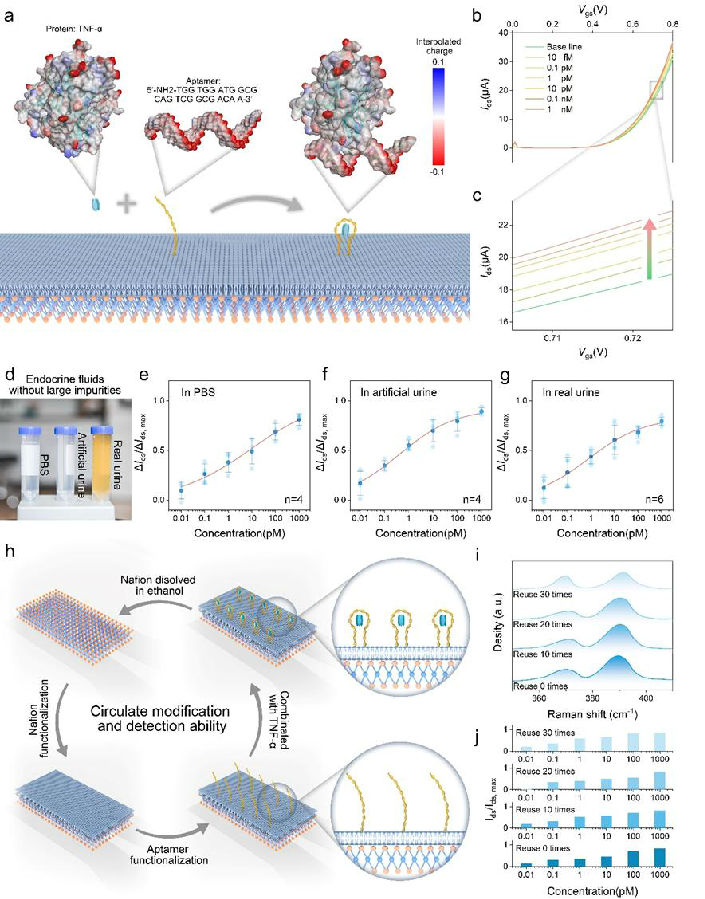 在真實(shí)檢測(cè)中,人體外分泌液中雜質(zhì)分子的存在會(huì)嚴(yán)重干擾蛋白的有效檢測(cè)。為了證實(shí)該檢測(cè)系統(tǒng)在不同溶液中的檢測(cè)能力,NM-FET分別在磷酸鹽緩沖溶液(PBS)、人工尿液和真實(shí)尿液中檢測(cè),均表現(xiàn)出較為出色的檢測(cè)能力。適配體和蛋白結(jié)合后通常無(wú)法自行分離,因此大多數(shù)基于適配體檢測(cè)的傳感器是一次性的。而如果可將傳感區(qū)域進(jìn)行回收處理,即可實(shí)現(xiàn)傳感器的重復(fù)利用。由于Nafion可溶于酒精,將使用過(guò)的NM-FET浸入酒精,MoS2通道表面的Nafion溶解,即可恢復(fù)到原始MoS2通道狀態(tài)。隨后使用Nafion和適配體進(jìn)行另一輪修飾,可恢復(fù)NM-FET的檢測(cè)能力。對(duì)NM-FET進(jìn)行30次循環(huán),每10次循環(huán)后測(cè)量MoS2表面的拉曼光譜,并使用修飾后的NM-FET進(jìn)行TNF-α濃度檢測(cè)。結(jié)果表明NM-FET可循環(huán)使用30次檢測(cè)周期,這有效提高了檢測(cè)系統(tǒng)的資源利用效率。