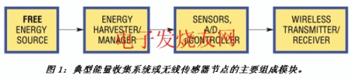 典型的能量收集配置或無線傳感器節(jié)點(diǎn)由4個模塊組成(見圖1)。它們是:1、一個環(huán)境能量源,比如:太陽能電池;2、一個用于給節(jié)點(diǎn)的其余部分供電的功率轉(zhuǎn)換組件;3、一個將節(jié)點(diǎn)鏈接到現(xiàn)實(shí)世界的感測組件以及一個計(jì)算組件(由微處理器或微控制器組成,負(fù)責(zé)處理測量數(shù)據(jù)并將這些數(shù)據(jù)存貯到存儲器中);4、一個由短程無線單元組成的通信組件,用于實(shí)現(xiàn)與相鄰節(jié)點(diǎn)及外部世界的無線通信。