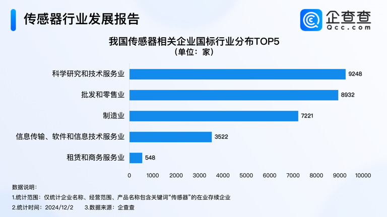 在行業(yè)分布方面,科學(xué)研究和技術(shù)服務(wù)業(yè)成為傳感器企業(yè)最為集中的領(lǐng)域,占比達(dá)到30.5%,共有9248家企業(yè)。緊隨其后的是批發(fā)和零售業(yè),占比29.5%,擁有8932家企業(yè)。制造業(yè)同樣占據(jù)重要地位,占比23.8%,共有7221家企業(yè)。