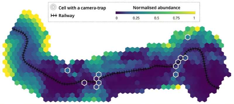 最后,將處理后的數(shù)據(jù)輸入到豐度模型中,這是另一種類型的生態(tài)模型。它用于使用僅在該區(qū)域中的幾個(gè)點(diǎn)收集的數(shù)據(jù)來估計(jì)研究區(qū)域每個(gè)部分的動(dòng)物可能密度。結(jié)果是一張地圖,其中顯示了物種的相對(duì)豐度,因此,顯示了基礎(chǔ)設(shè)施沿線的碰撞風(fēng)險(xiǎn)。
