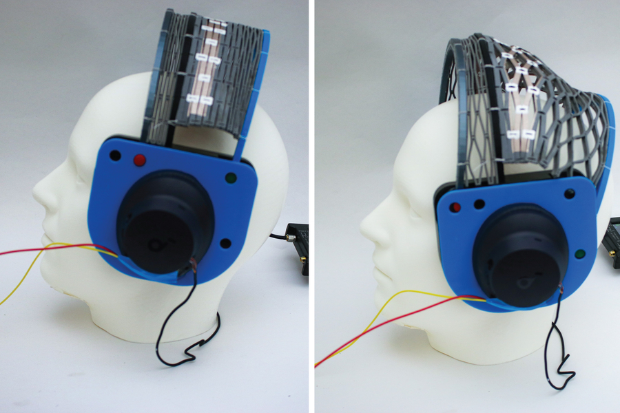 圖片說明:在智能耳機(jī)原型中,當(dāng)超材料天線展開并彎曲時,其諧振頻率會偏移 2.6%,進(jìn)而實(shí)現(xiàn)耳機(jī)模式的切換。