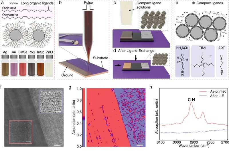 配體交換(L-E)輔助納米晶體(NCs)納米打印技術(shù)示意圖。來源:《自然通訊》(2025)。DOI:10.1038/s41467-025-64596-4