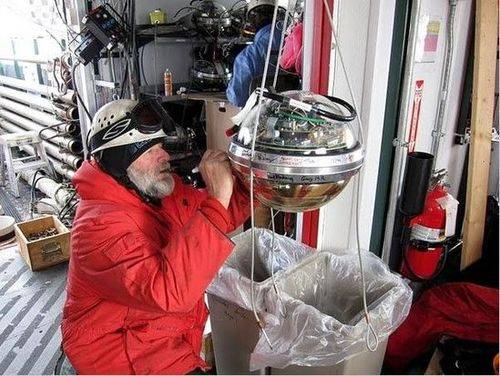 冰立方建設(shè)小組的成員在測(cè)試傳感器(圖左部分顯露),另一位科學(xué)家正在將一個(gè)單獨(dú)的傳感器掛在電纜上。天文臺(tái)區(qū)別于兩個(gè)輔助探測(cè)器的主探測(cè)器被安置在體積為一平方公里的冰層中,而南極是唯一能找到如此巨大冰塊的地方。美國(guó)國(guó)家科學(xué)基金會(huì)表示,天文臺(tái)的規(guī)模越大就越靈敏,因?yàn)槊娣e的增加意味著中微子和水核的碰撞就越有可能被觀測(cè)到。