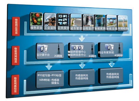 從技術(shù)架構(gòu)上來看,物聯(lián)網(wǎng)可分為三層:感知層、網(wǎng)絡(luò)層和應(yīng)用層。感知層由各種傳感器以及傳感器網(wǎng)關(guān)構(gòu)成,包括二氧化碳濃度傳感器、溫度傳感器、濕度傳感器、二維碼標(biāo)簽、RFID 標(biāo)簽和讀寫器、攝像頭、GPS等感知終端。感知層的作用相當(dāng)于人的眼耳鼻喉和皮膚等神經(jīng)末梢,它是物聯(lián)網(wǎng)獲識別物體,采集信息的來源,其主要功能是識別物體,采集信息,并且將信息傳遞出去。網(wǎng)絡(luò)層由各種私有網(wǎng)絡(luò)、互聯(lián)網(wǎng)、有線和無線通信網(wǎng)、網(wǎng)絡(luò)管理系統(tǒng)和云計算平臺等組成,相當(dāng)于人的神經(jīng)中樞和大腦,負(fù)責(zé)傳遞和處理感知層獲取的信息。應(yīng)用層是物聯(lián)網(wǎng)和用戶(包括人、組織和其他系統(tǒng))的接口,它與行業(yè)需求結(jié)合,實現(xiàn)物聯(lián)網(wǎng)的智能應(yīng)用。物聯(lián)網(wǎng)的行業(yè)特性主要體現(xiàn)在其應(yīng)用領(lǐng)域內(nèi),目前綠色農(nóng)業(yè)、工業(yè)監(jiān)控、公共安全、城市管理、遠(yuǎn)程醫(yī)療、智能家居、智能交通和環(huán)境監(jiān)測等各個行業(yè)均有物聯(lián)網(wǎng)應(yīng)用的嘗試,某些行業(yè)已經(jīng)積累一些成功的案例。