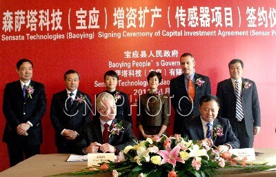 1月19日,美國森薩塔科技公司在揚州正式簽約增資擴產(chǎn)(寶應(yīng))傳感器項目。當(dāng)日,揚州市委書記王燕文、市長謝正義等官員和來自美國森薩塔科技公司總裁兼首席運營官瑪莎·蘇利文、執(zhí)行副總裁、首席財務(wù)官、首席行政官杰夫·科特等共同參加簽約儀式。圖為寶應(yīng)縣縣長王庭國與森薩塔科技運營高級副總裁迪克·。ㄓ遥┓謩e代表雙方簽約,增資擴產(chǎn)傳感器項目,將新建32500平方米的五層廠房,預(yù)計在2011年2月動工并在年底竣工。