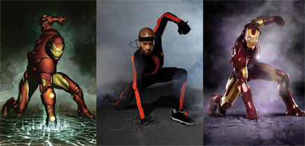 穿戴著Xsens公司MVN Motion Capture彈力纖維套裝的演員(中間),身上鑲滿了ADI公司的MEMS慣性傳感器。他模仿傳奇漫畫"鋼鐵俠"插圖中的特征手勢(shì)(左),作為創(chuàng)作派拉蒙影業(yè)公司"鋼鐵俠2”(右)動(dòng)畫的基礎(chǔ)。