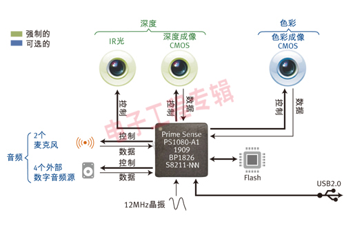 微軟的Xbox Kinect以PrimeSense參考設(shè)計(jì)為基礎(chǔ),使用兩個(gè)CMOS成像器(一個(gè)用于紅外光,一個(gè)用于可見光)檢測(cè)3D深度,因此系統(tǒng)能夠輕松辨別房間內(nèi)的游戲玩家和背景物體。