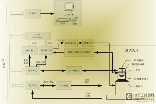 測試系統(tǒng)原理如圖4所示。振動測試采用相對法,實現(xiàn)對汽車爆震傳感器3kHz~40kHz頻帶范圍內任意頻率點的靈敏度測試,并可以對電容、絕緣電阻等檢測。測試系統(tǒng)采用PXI構架,通過PXI模塊化儀器或GPIB儀器實現(xiàn)控制及信號采集。