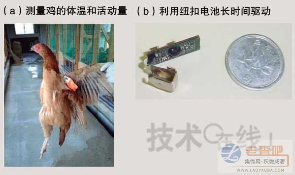 。╝)為配備在雞只身上的老款無線傳感器節(jié)點。(b)為新開發(fā)的無線傳感器節(jié)點。用紐扣電池可工作約500天。
