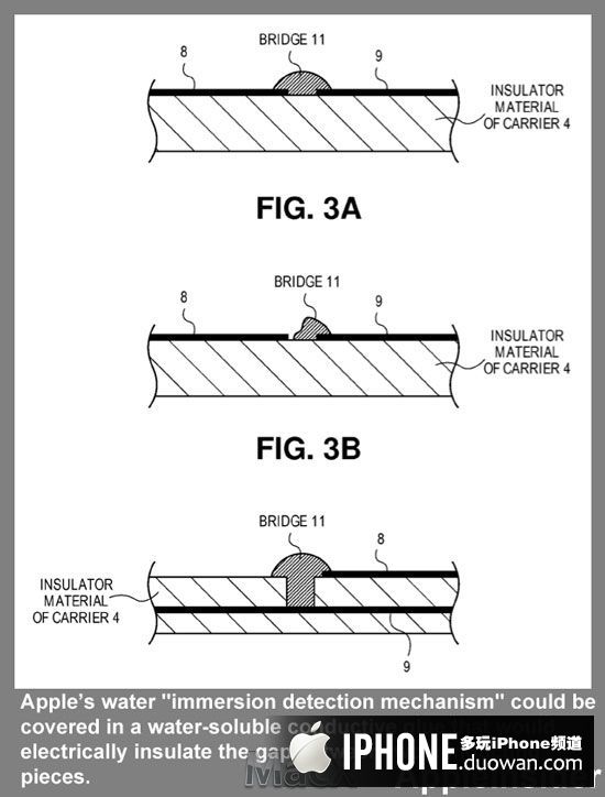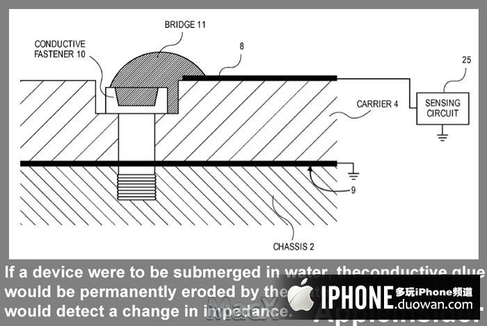 蘋果提出的解決方案是一種存在設(shè)備內(nèi)部的“侵入式檢測機制”。誰傳感器可以使用水溶性導電膠覆蓋,這樣一旦設(shè)備進水,兩個傳感器之間就出現(xiàn)了隔離。在此之后,設(shè)備會將進水的數(shù)據(jù)記錄下來。