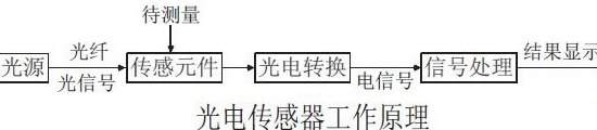 隨著工藝水平的提高,光纖技術(shù)目前相對成熟。光纖傳感器即為應(yīng)用光纖傳輸?shù)幕驹斫M合的一個(gè)廣電感應(yīng)系統(tǒng)。通常的光纖傳感系統(tǒng)由光源、光導(dǎo)纖維、光傳感元件,光調(diào)制元件和信號處理部分組成[3]。其工作原理如下圖所示:光源發(fā)出的光經(jīng)過光導(dǎo)纖維進(jìn)入光傳感元件,而在光傳感元件中受到周圍環(huán)境場的影響而發(fā)生變化的光再進(jìn)入光調(diào)制機(jī)構(gòu),由其將傳感元件測量的參數(shù)調(diào)制成幅度、相位、偏振等信息,這一過程稱為光電轉(zhuǎn)換過程,最后利用微處理器進(jìn)行信號分析。