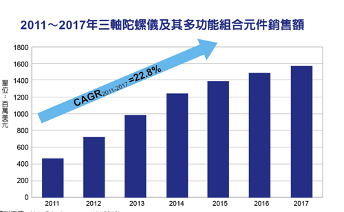 三軸陀螺儀(Gyroscope)及其多功能組合(Combo)元件銷售量將強(qiáng)勁增長(zhǎng)。YoleDeveloppement研究報(bào)告指出,在消費(fèi)性應(yīng)用需求成長(zhǎng)的驅(qū)動(dòng)下,三軸陀螺儀及其多功能組合元件的銷售額,將從2011年的4億5,800萬美元,擴(kuò)大到2017年的15億7,000萬美元,成長(zhǎng)將近四倍,年復(fù)合成長(zhǎng)率(CAGR)亦高達(dá)22.8%。